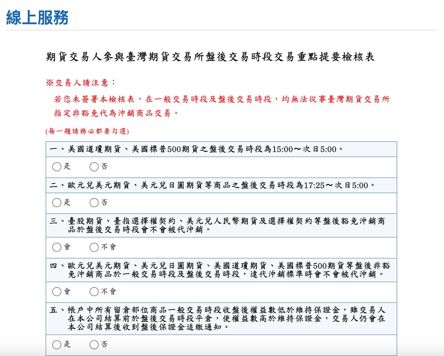 以上商品都需要簽署國內盤後交易檢核表才能交易