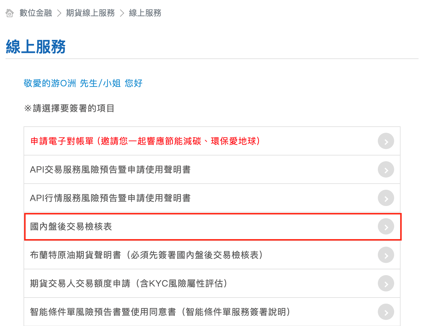 因應台灣期交所規定想要交易「非豁免代為沖銷商品」,就必須要先簽署「國內盤後交易檢核表」