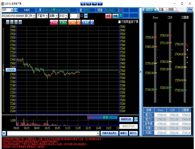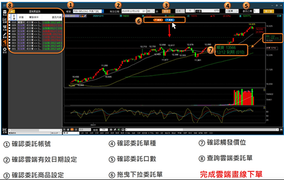 全視線下單,將走勢圖與下單匣兩者結合,運用滑鼠於走勢圖上拖曳至指定價格,就可下單